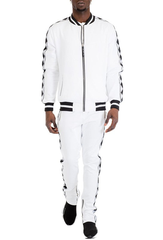 Introducing the DIAMOND TAPE TRACK SET! This set includes a full zip track jacket and elastic waist track pants with ankle zipper for added style and convenience. Made with 95% polyester and 5% spandex, it's both comfortable and durable. Plus, our model who is 5'11 and wearing a medium can attest to its amazing fit.