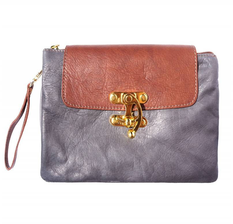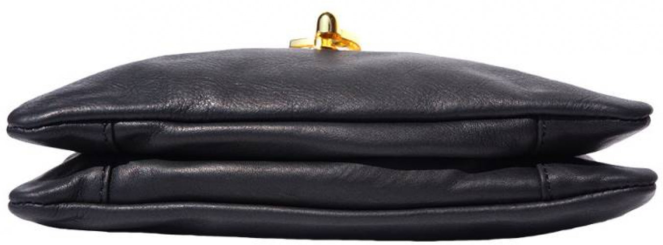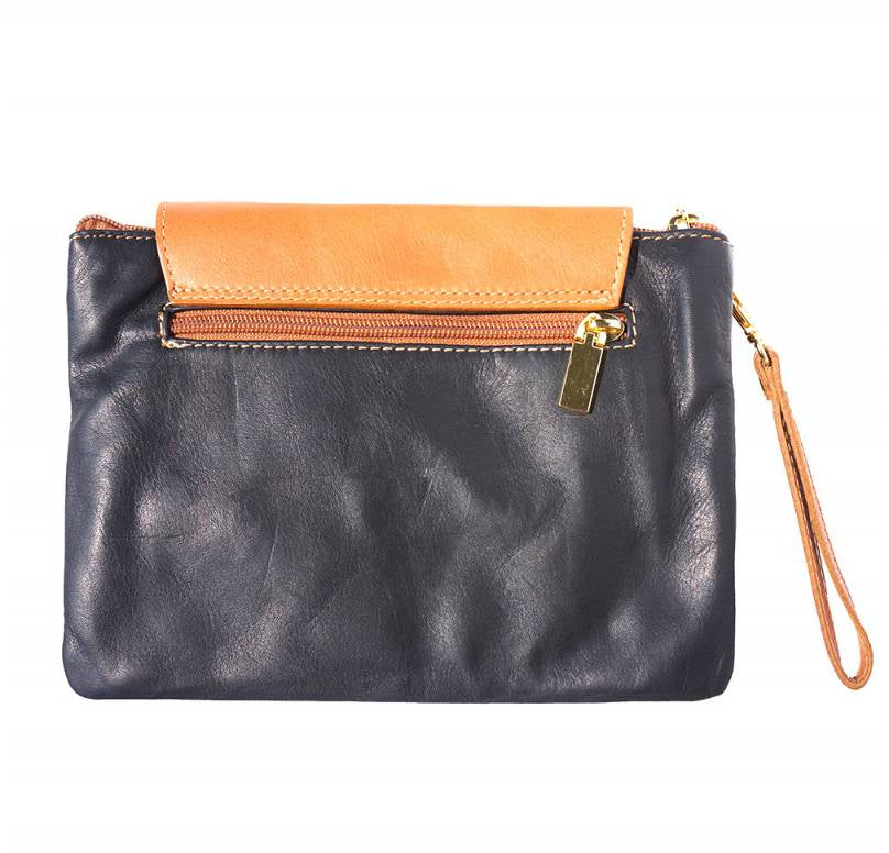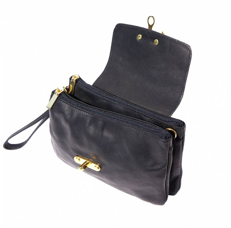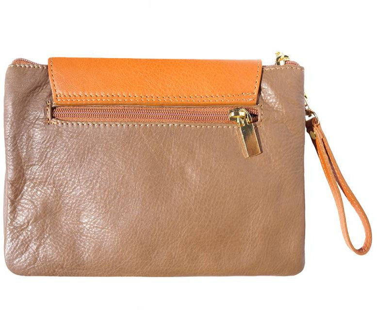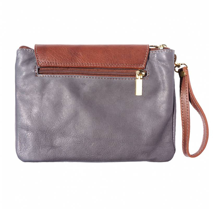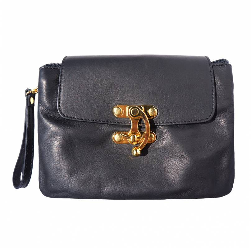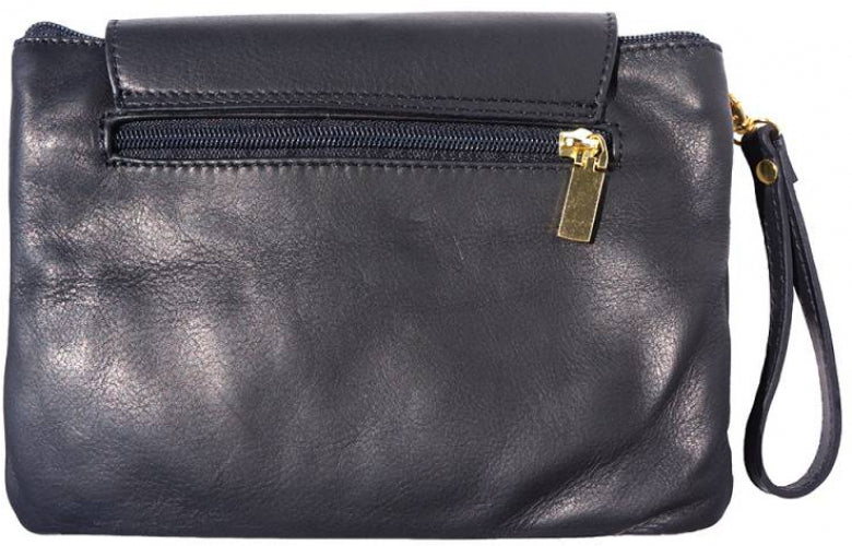 A soft clutch crafted from genuine calf leather. Zip closure with detachable and adjustable leather shoulder strap. Leather wrist strap with carabiner. Zip pocket on the back side. Two compartments. Cotton lining inside. One pocket with zip. Golden hardware. Handmade in Italy.Description