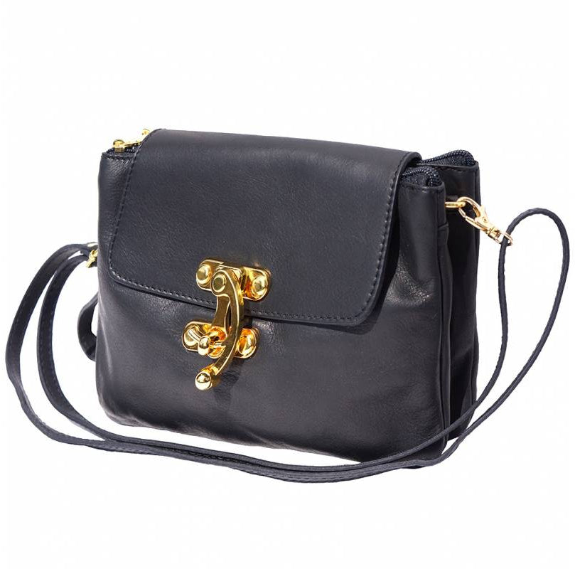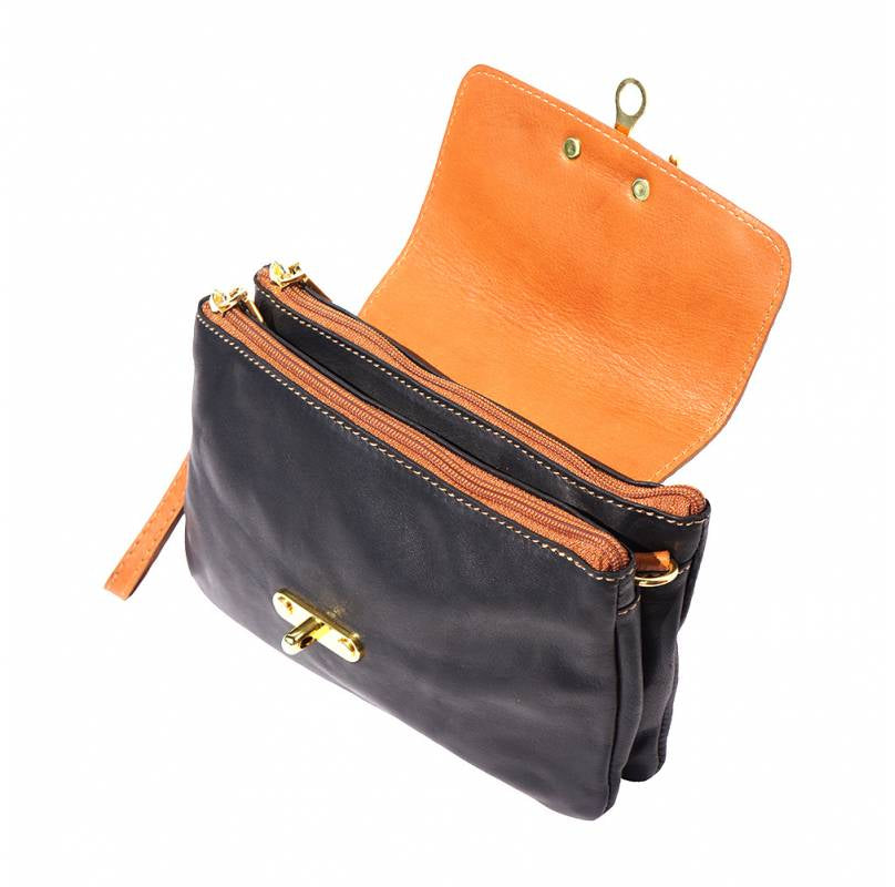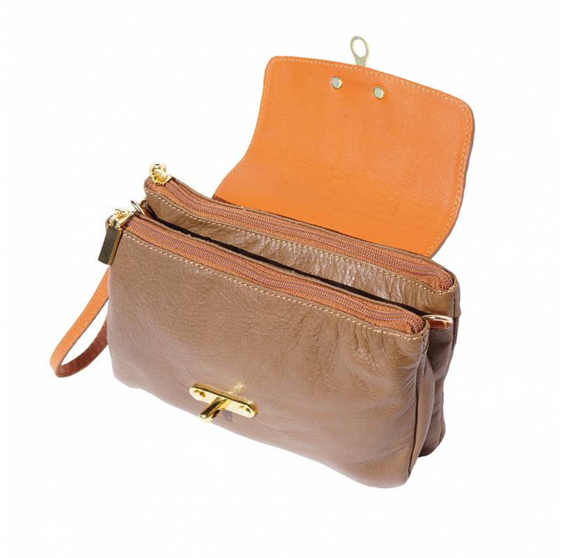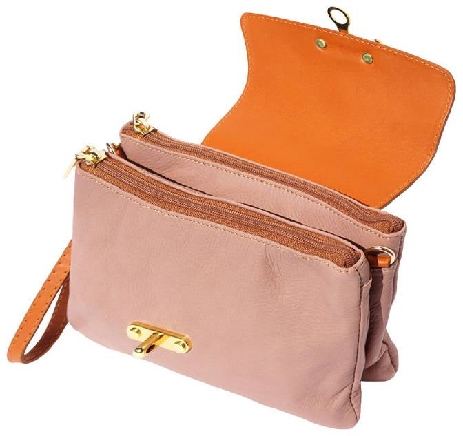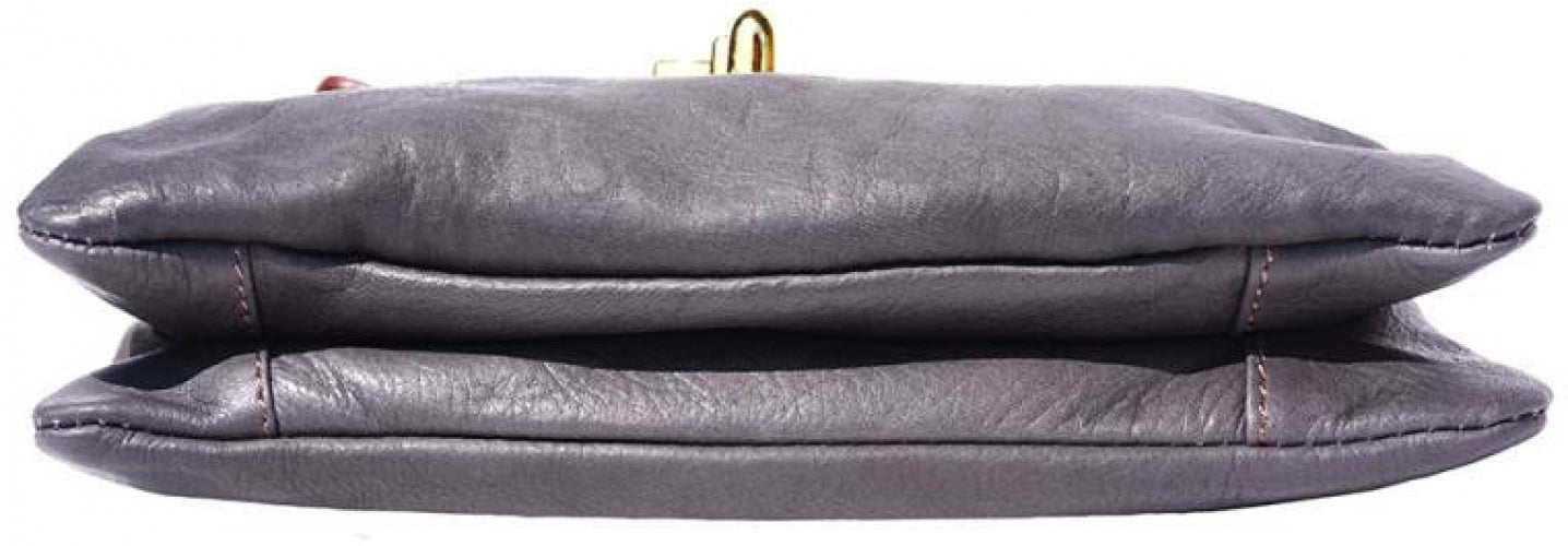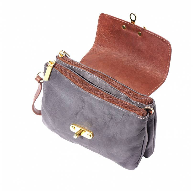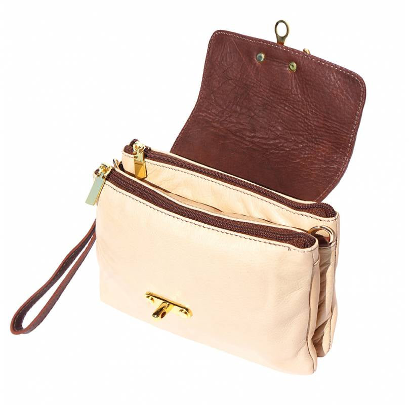 A soft clutch crafted from genuine calf leather. Zip closure with detachable and adjustable leather shoulder strap. Leather wrist strap with carabiner. Zip pocket on the back side. Two compartments. Cotton lining inside. One pocket with zip. Golden hardware. Handmade in Italy.Description