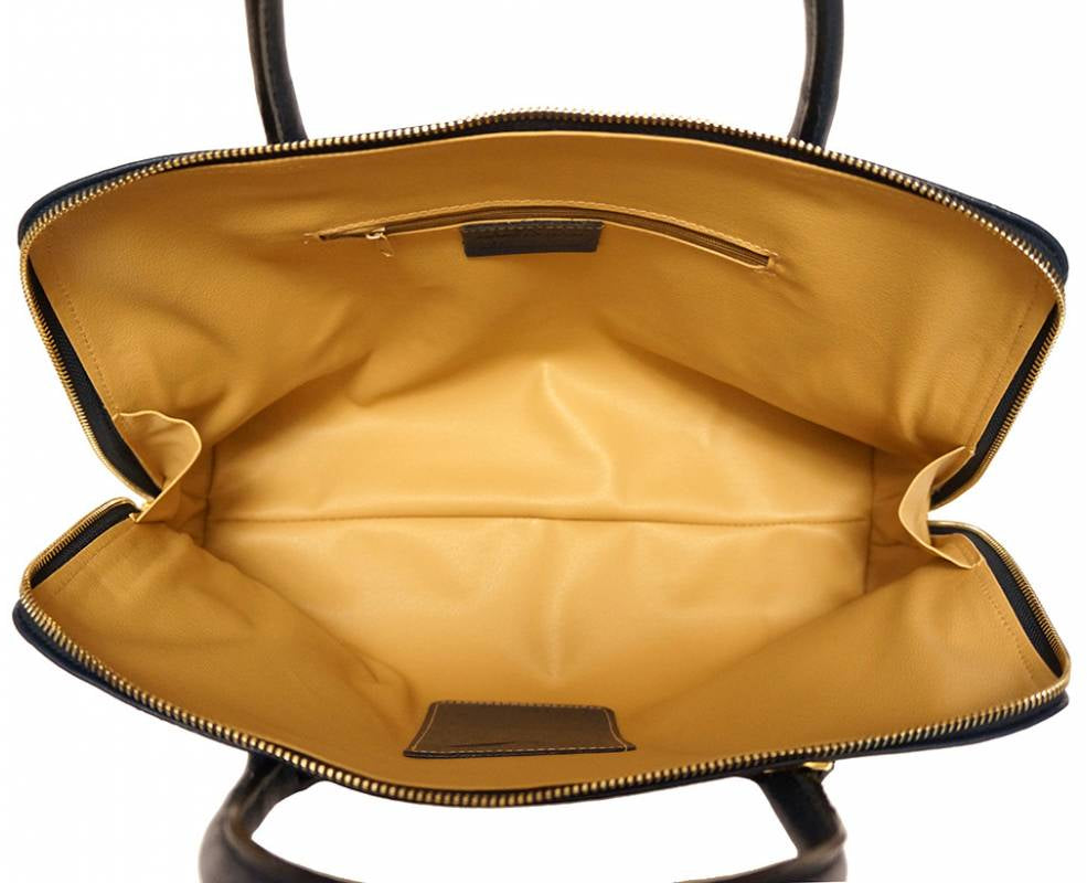 One compartment. Inner zip pocket. Smartphone holder. A4 format. Can fit Ipad. Protective metal studs on the bottom. Golden hardware.