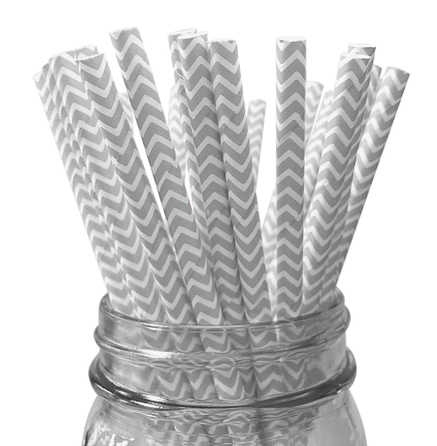 These silver and white chevron themed paper straws are printed with silver chevron designs throughout. This pack of 100 silver and white chevron themed paper straws come in 4 packs that contain 25 paper straws in each pack and are unboxed.