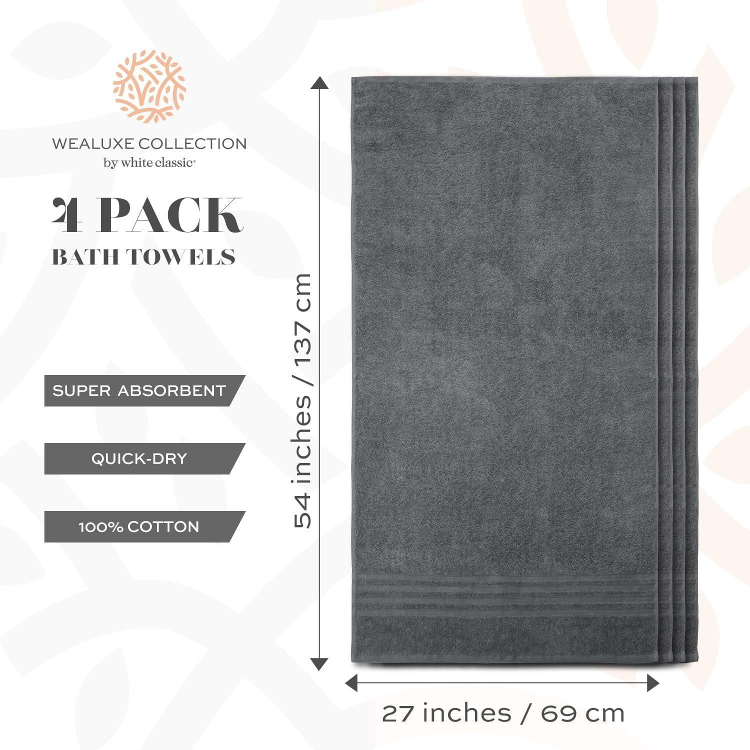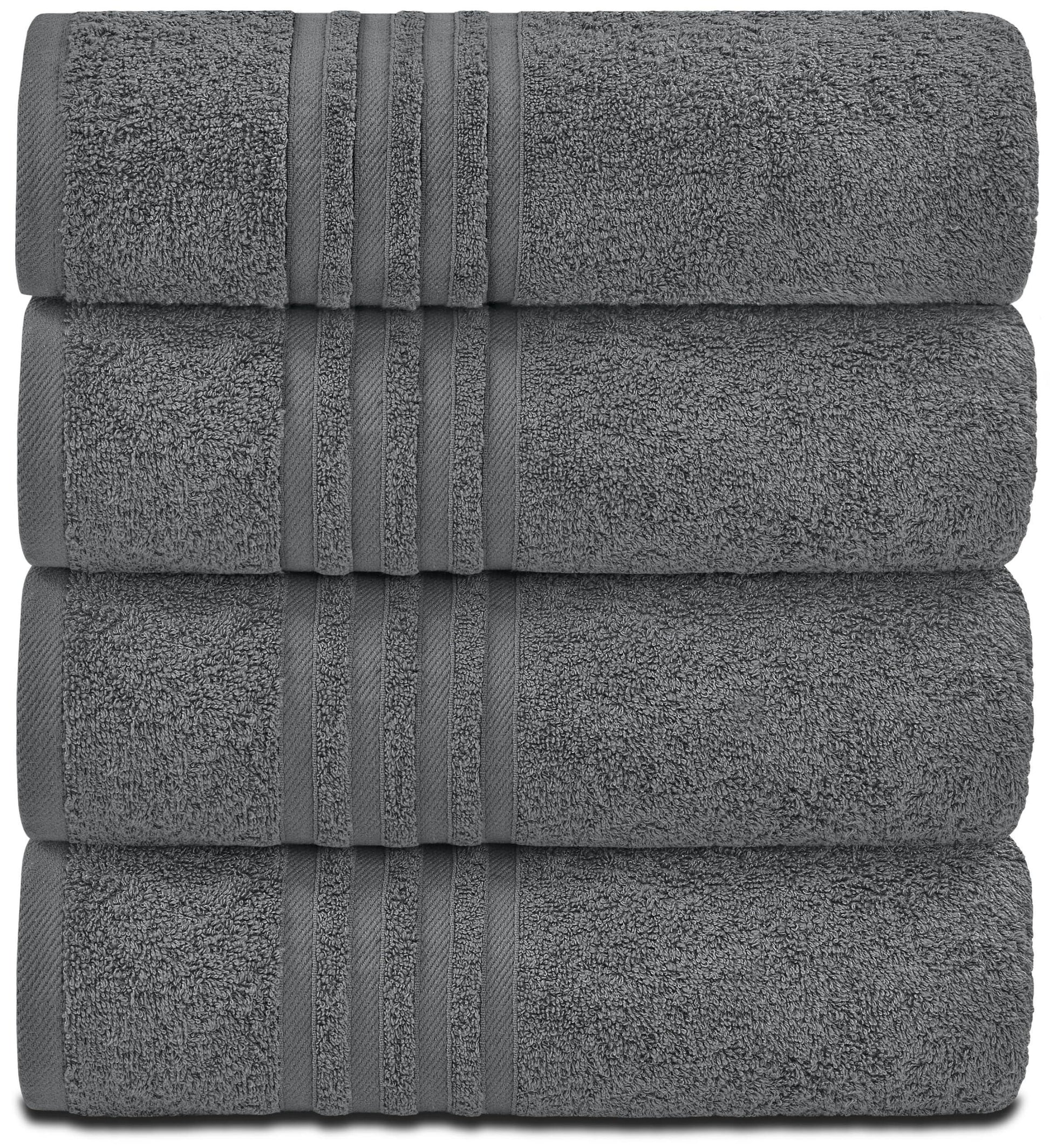 High Quality - 100% ring spun cotton extra absorbent bath towels is for ultimate softness. Towels are durable and stands up to wear and tear while retaining softness. All edges are double stitched hemmed for longevity and durability Value Bundle - these 4 matching quick drying grey towels bulk will beautify you bathroom decor. Towel measures 27 by 52 inches, perfect for multipurpose usage. Great use for shower, beach, pool, spa, gym, hotel and home Easy Care - Machine washable for easy care and cleaning. These towels are especially processed and are lint-free, their lighter ribbed construction results in less time needed in the dryer. Specially processed to resist shrinking and retain whiteness Extra Absorbent - Premium terry towel material allows for maximum absorbency. Large size towel set is designed to provide you with all your basic bathroom drying needs like wiping your head, body, face or hands. Best for a guest